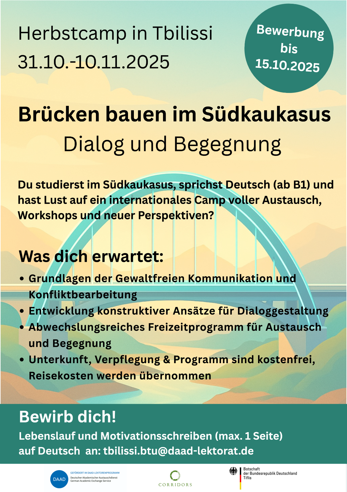 თუ ცხოვრობ სამხრეთ კავკასიაში და იცი გერმანული (B1 და ზემოთ), მიიღე მონაწილეობა საშემოდგომო ბანაკში, რომელიც უამრავ საინტერესო ვორქშოპს, ექსკურსიას და შეხვედრას მოიცავს