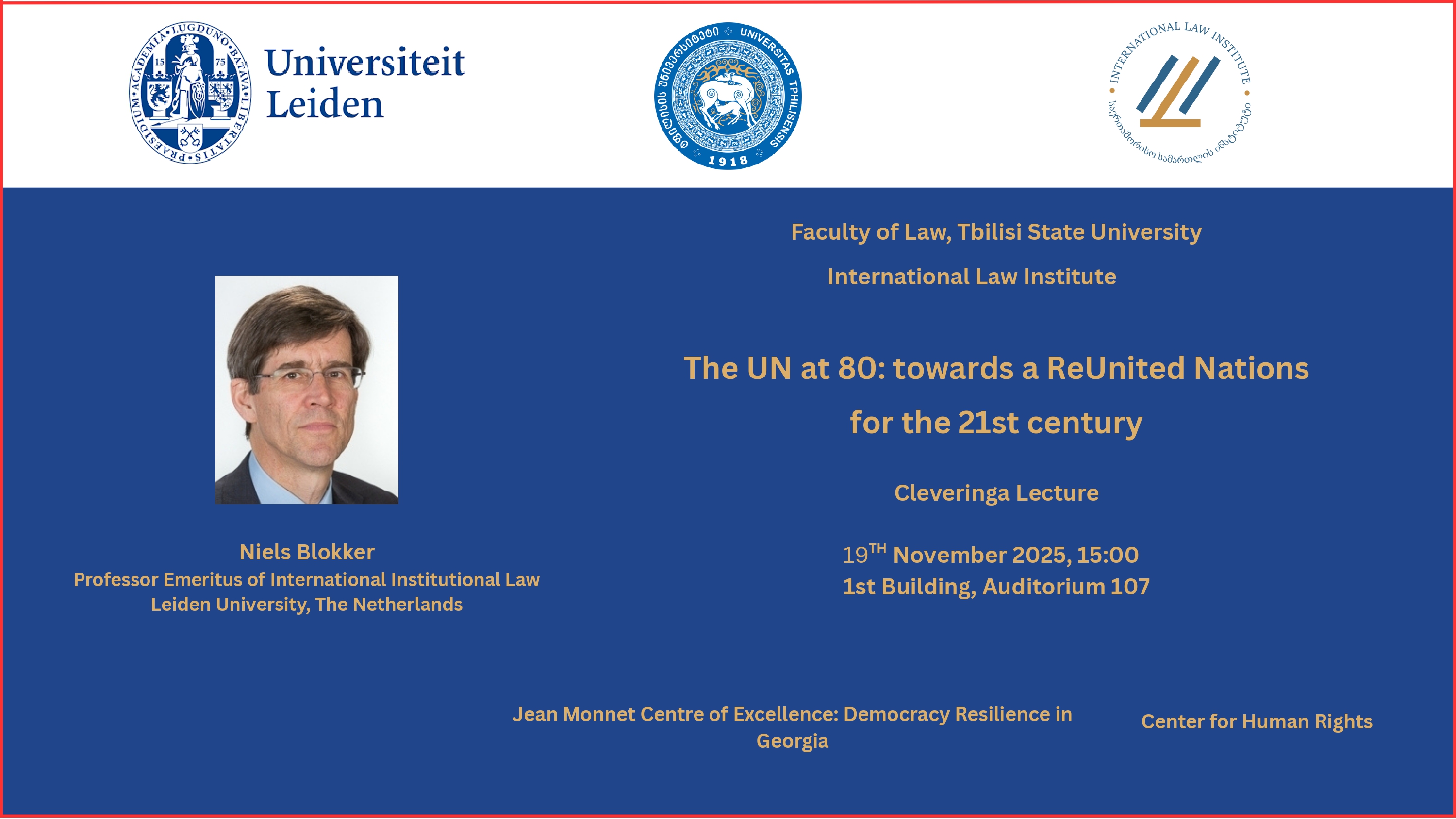 გაცნობებთ, რომ ამა წლის 19 ნოემბერს, 15 საათზე, თბილისის სახელმწიფო უნივერსიტეტის პირველი კორპუსის 107-ე აუდიტორიაში გაიმართება „კლევერინგას ლექცია“. ლექციას ჩაატარებს ლეიდენის უნივერსიტეტის პროფესორი ნილს ბლოკერი, რომელიც მიიჩნევა მსოფლიოში ერთ-ერთ წამყვან ექსპერტად საერთაშორისო ორგანიზაციების სამართალში.